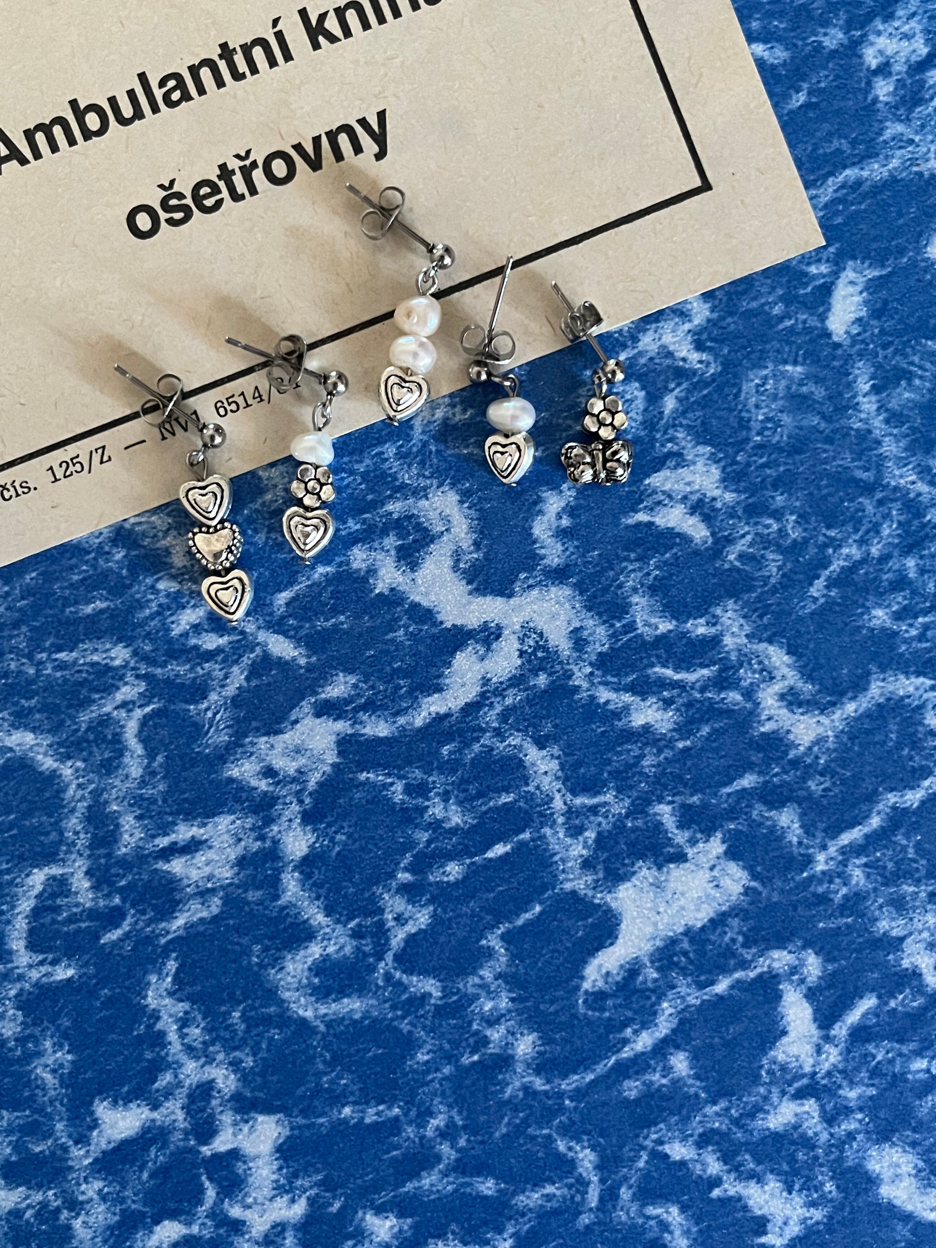 お花、ハート、蝶のパーツとパールを合わせたミニサイズのピアス。