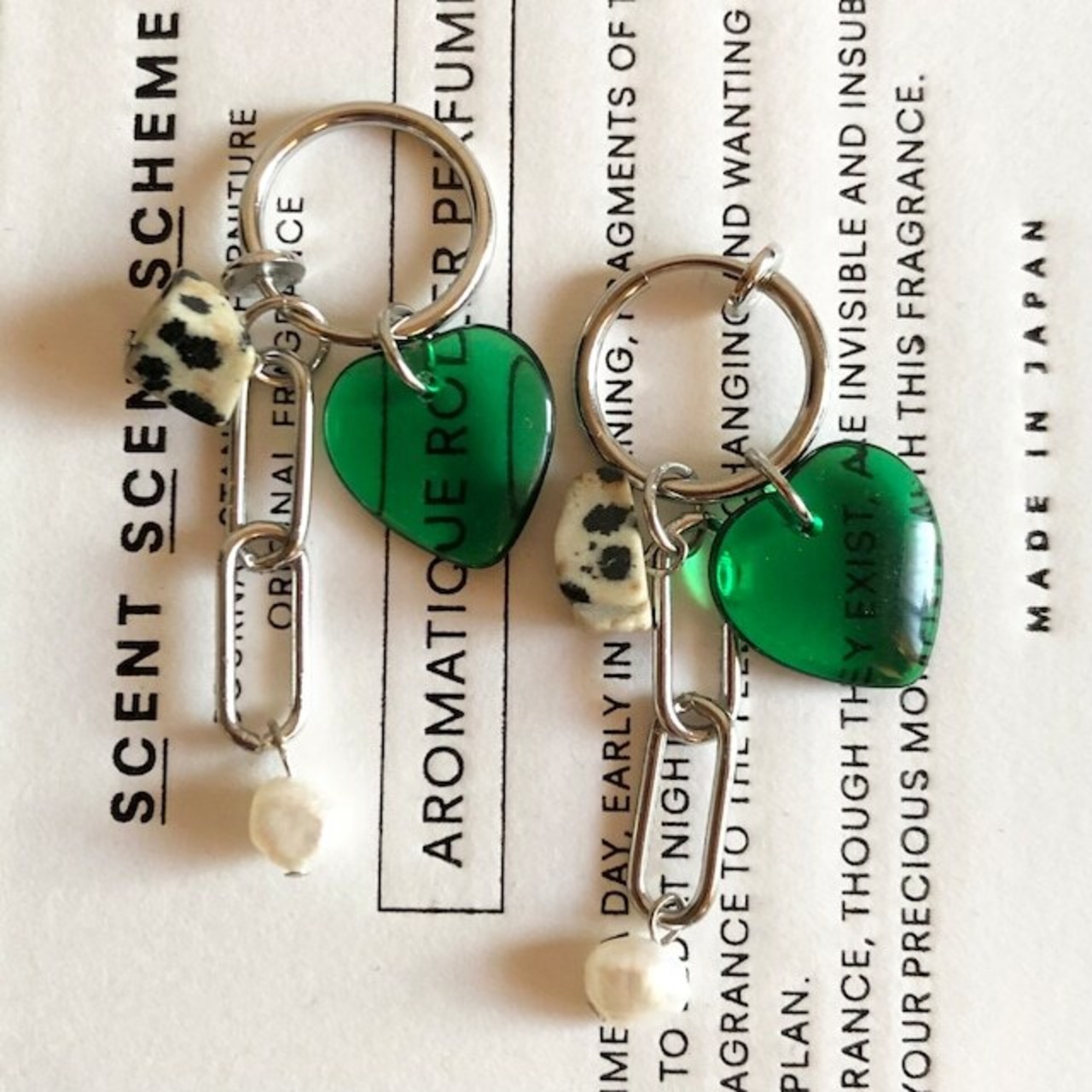 グリーンの透け感が綺麗なヴィンテージガラスのハートのピアス。